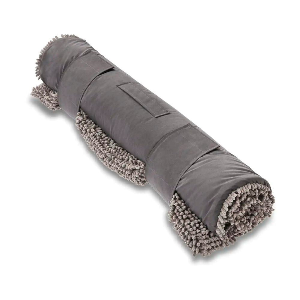 Die Innenseite der Reisedecke besteht aus zahlreichen weichen Mikrofasersträngen. Diese absorbieren Feuchtigkeit und Schmutz im Nu und trocknen das Fell deines Hundes schneller als ein übliches Handtuch. Nach einem Spaziergang am Strand kann es sich dein Hund auf der kuscheligen Hundedecke im Café gemütlich machen, während sein Fell trocknet und der Sand von den Mikrofasersträngen aufgenommen und festgehalten wird. Dein Liebling ist in kurzer Zeit wieder trocken und das Café, deine Ferienwohnung oder dein Auto bleiben sauber! Schnell und unkompliziert lässt sich die Reisedecke aufrollen und dank praktischer Klettverschlüsse fixieren. Ein Tragegriff erleichtert den Transport.
