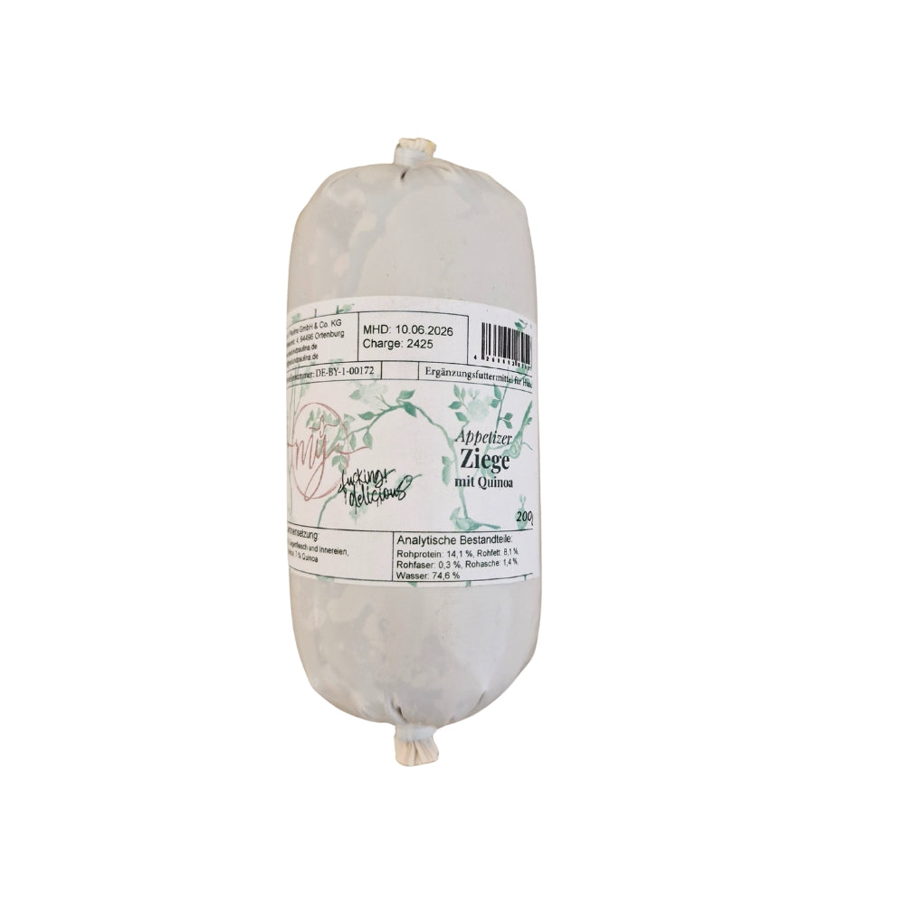 Zusammensetzung: 45% Muskelfleisch von der Ziege, 20% Ziegenherz, 15% Ziegenlunge, 10% Ziegenkehlkopf, 5% Ziegenleber, 5% Fleischbrühe