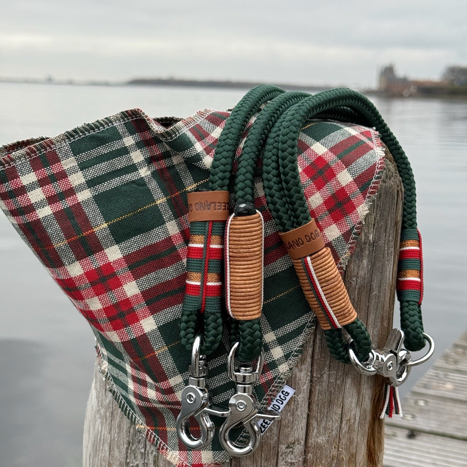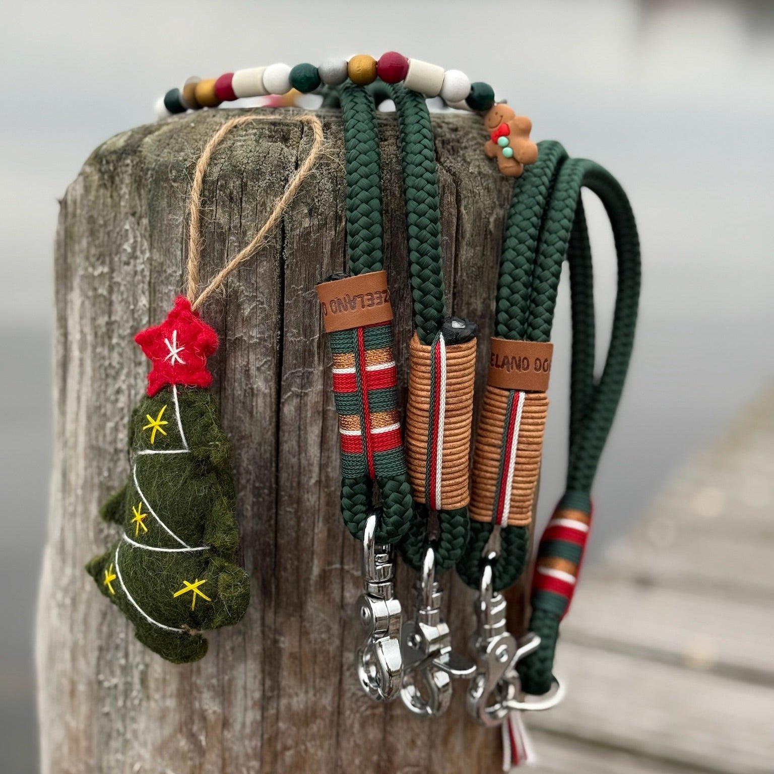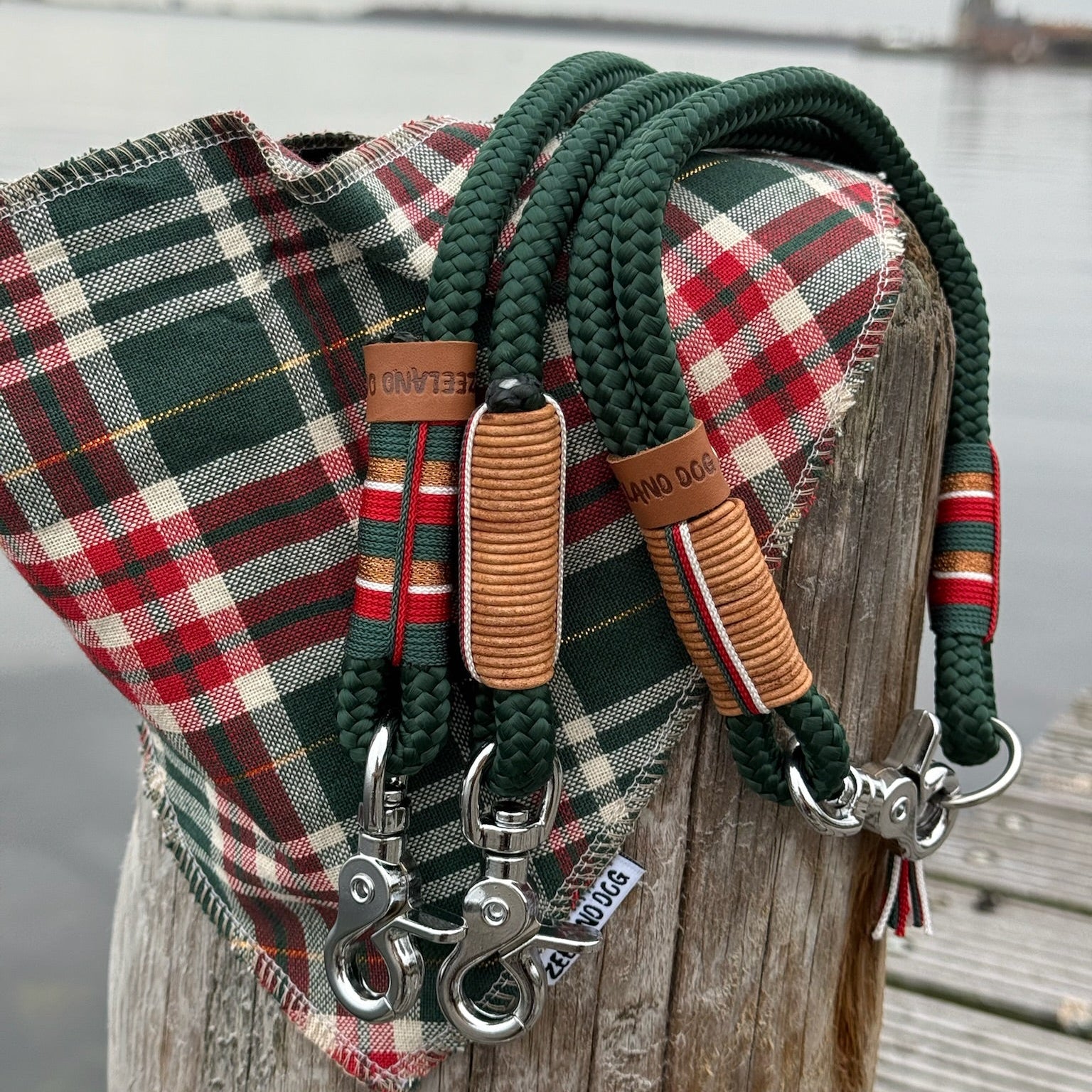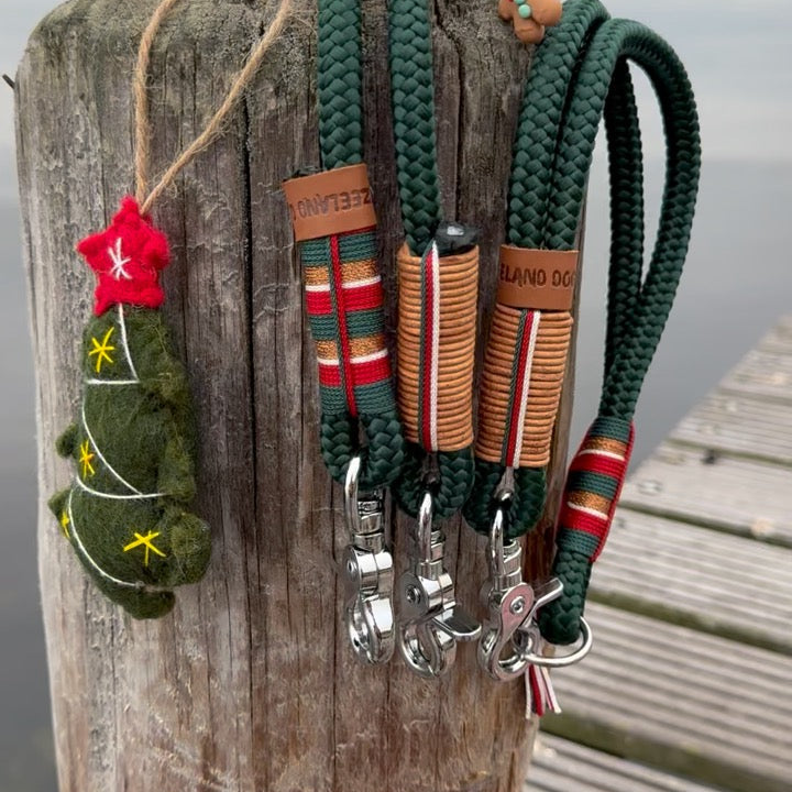 Das neue Santa-Set bringt Weihnachtsstimmung an die Leine – mit tiefgrünem Tau, warmen Lederdetails und liebevollen Garnakzenten in Rot, Creme und Gold.