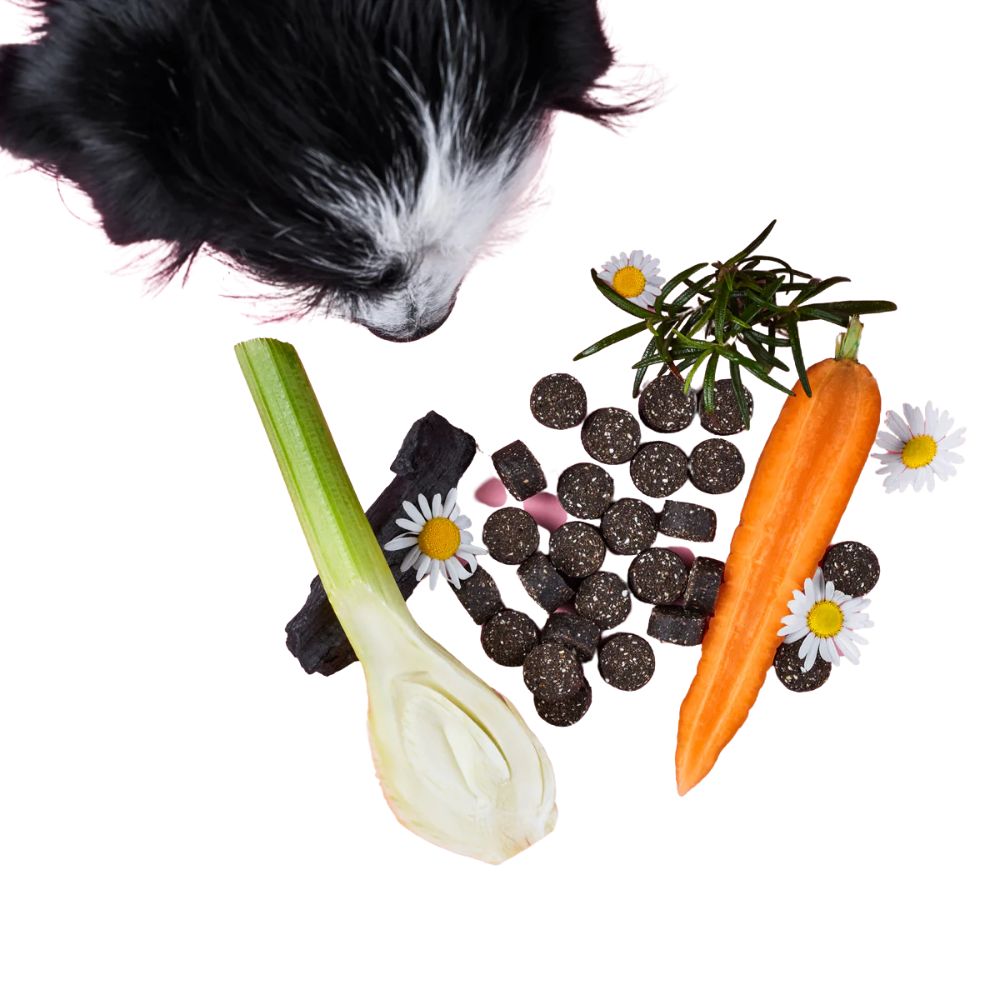 The intestinal care formula contains natural plant charcoal, which binds unwanted fluids in the dog's intestines and quickly solidifies stools. At the same time, the herbal blend with psyllium, chamomile, and fennel gently cares for your dog's intestines. Simply feed it as a daily treat – and stools and digestion will be optimal again!