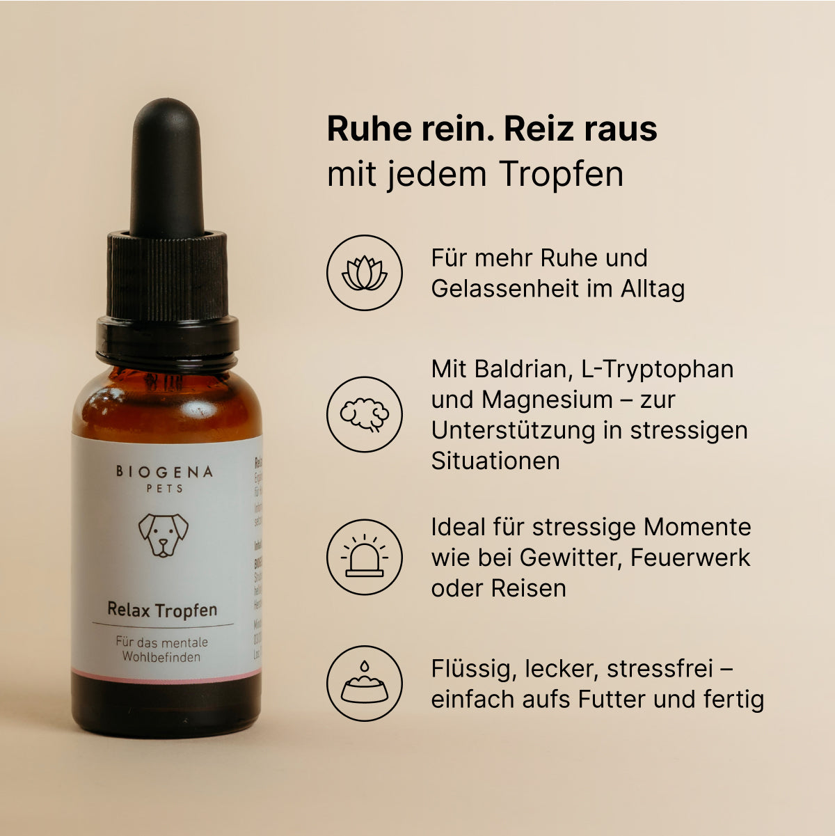 Situationen wie Gewitter, laute Geräusche, Autofahrten oder Tierarztbesuche können deinen Hund herausfordern und aus dem Gleichgewicht bringen. Die BIOGENA PETS Relax Tropfen wurden speziell entwickelt, um deinen Hund in fordernden Momenten zu begleiten – mit ausgewählten Nährstoffen für mehr Balance, ohne müde zu machen. Mit natürlichen beruhigenden Kräutern wie Baldrian, Magnesium und L-Tryptophan. Dank dieser Kombination liefern die Tropfen Nährstoffe, die zur normalen Funktion des Nervensystems beitragen – abgestimmt auf sensible Situationen.