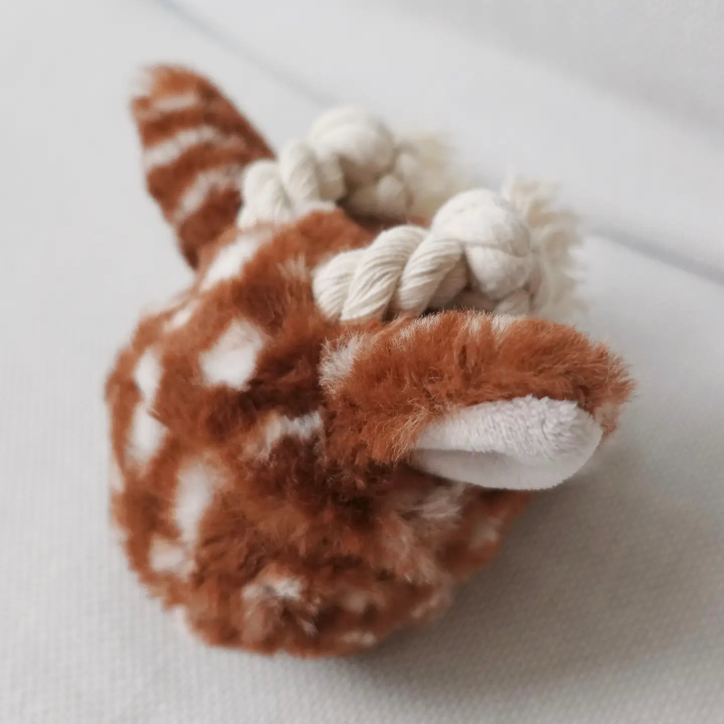 Im Inneren steckt ein quietschender TPR-Ball, der robust und langlebig ist, aber dennoch angenehm weich im Maul liegt. Außen sorgt ein abnehmbarer, waschbarer Plüschüberzug in Rehkitzoptik für extra Kuschelfaktor – und das gewisse Etwas beim Spielen.