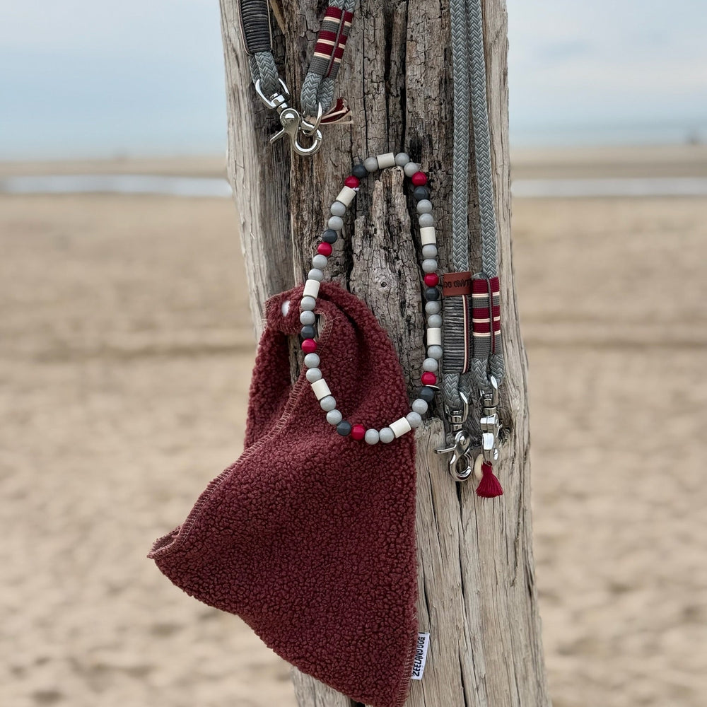 Das graue Tau erinnert an einen nebligen Morgen, während die kleinen roten Akzente für einen fröhlichen Farbtupfer sorgen. Ob beim Spaziergang durch den Park oder beim Kuscheln zuhause – mit diesem Set ist dein Hund immer stylisch unterwegs.